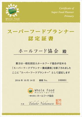 そして、講座の認定試験に合格することで一般社団法人 ホールフード協会が認定する