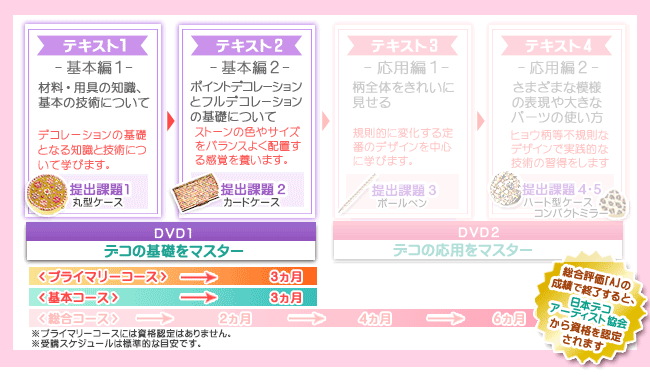 講座はテキスト・DVDで学んだ内容をレッスンパネルや提出課題で実際にデコレーションする実技が中心となります。提出課題は全部で2回。花モチーフや整列での全面ばりなど指定のデザインをピルケースなどの小物にデコレーションしてお送りいただきます。課題作品は藤井先生はじめプロのデコアーティストが1点ずつていねいに講評し、アドバイスを添えてご返却します。マンツーマンによるプロの指導を直接受けられるので、自宅にいながら、確実に上達します!