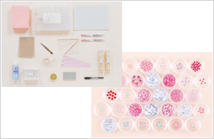 - アクリルストーン各種、デコレーション用小物(丸形ケース、カードケース)、ピンセット、接着剤、接着剤用台紙、竹串、除光液、綿棒、ストーンスケール、三角定規、油性ペン(1色)、ペーパータオル、セロハンテープ、収納ケース、レッスンパネル