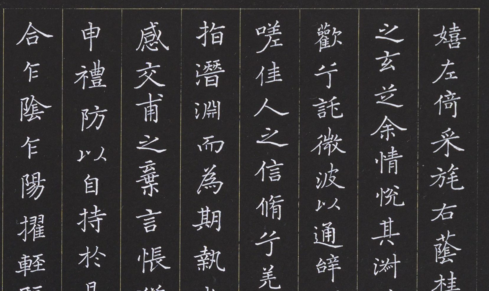 展覧会作品で多く展示されている「黒地」の作品。黒や濃色の用紙に白インクで書かれた美しい作品は会場でも目を引きます。